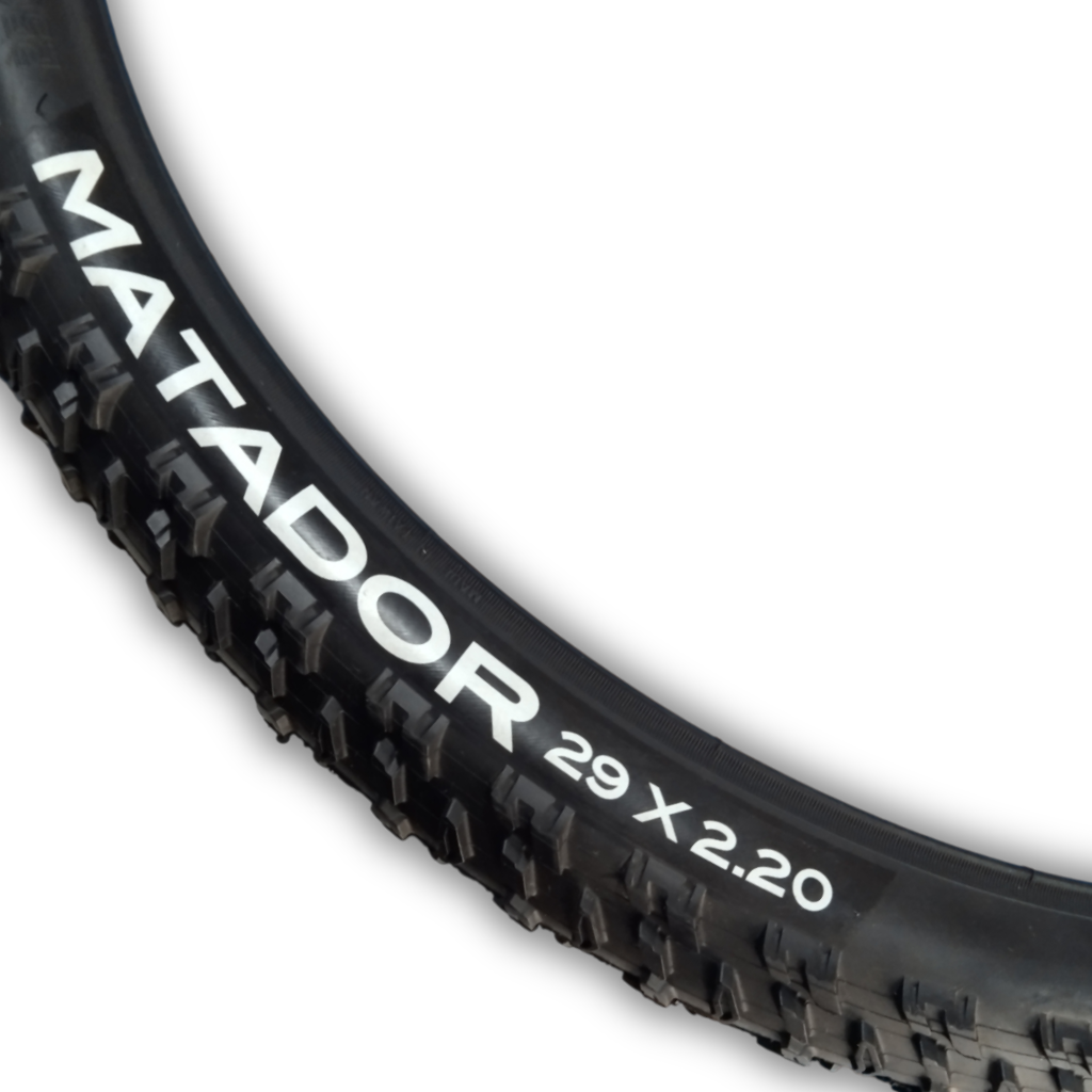 Características: Medida 29x2.20 | Construcción con aro de alambre (wire bead) | Diseño de tacos intermedios para terrenos mixtos | Uso MTB, XC, urbano recreativo | Compatible con cámara | Presión recomendada: 40–65 PSI | Peso aproximado: 900 g | Marca: Duro | Modelo: Matador | Color: Negro